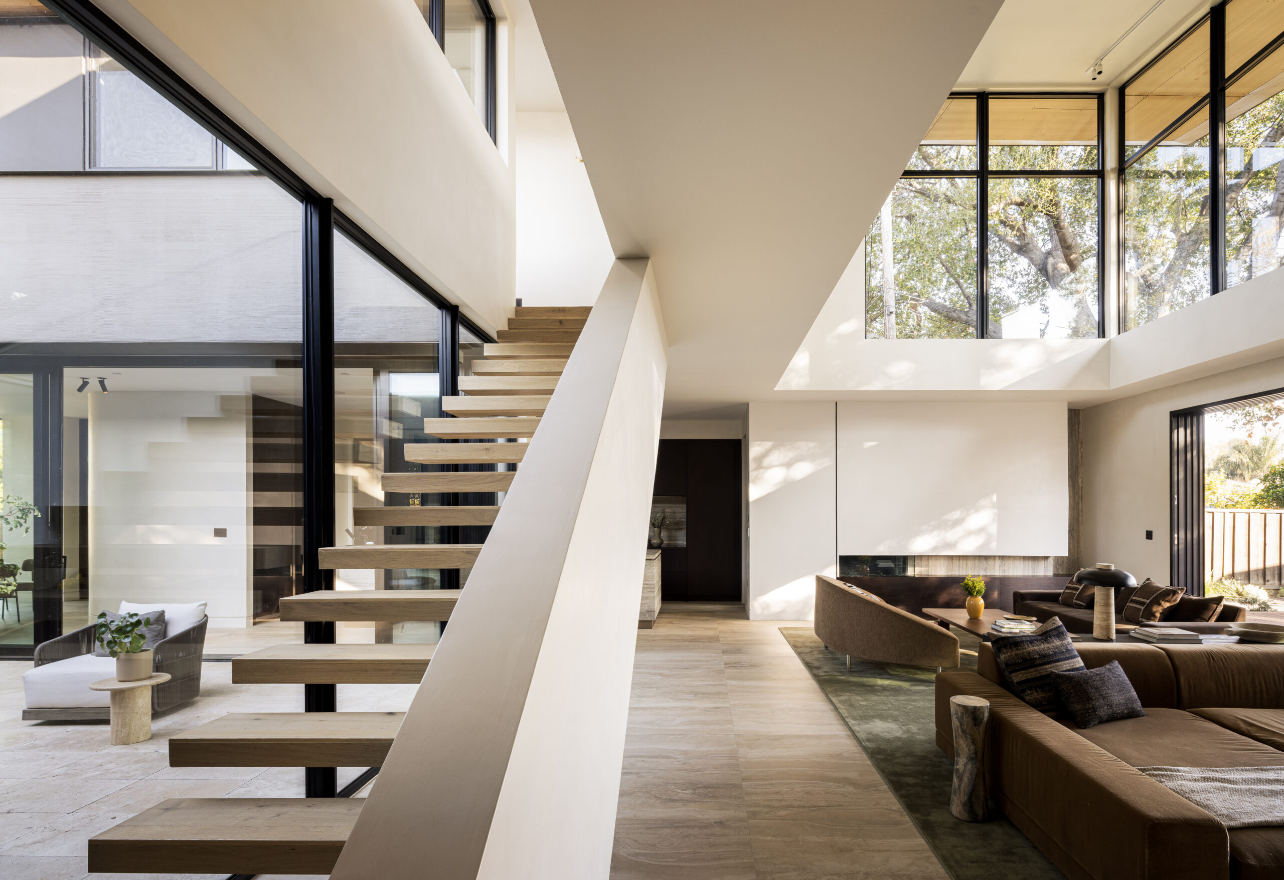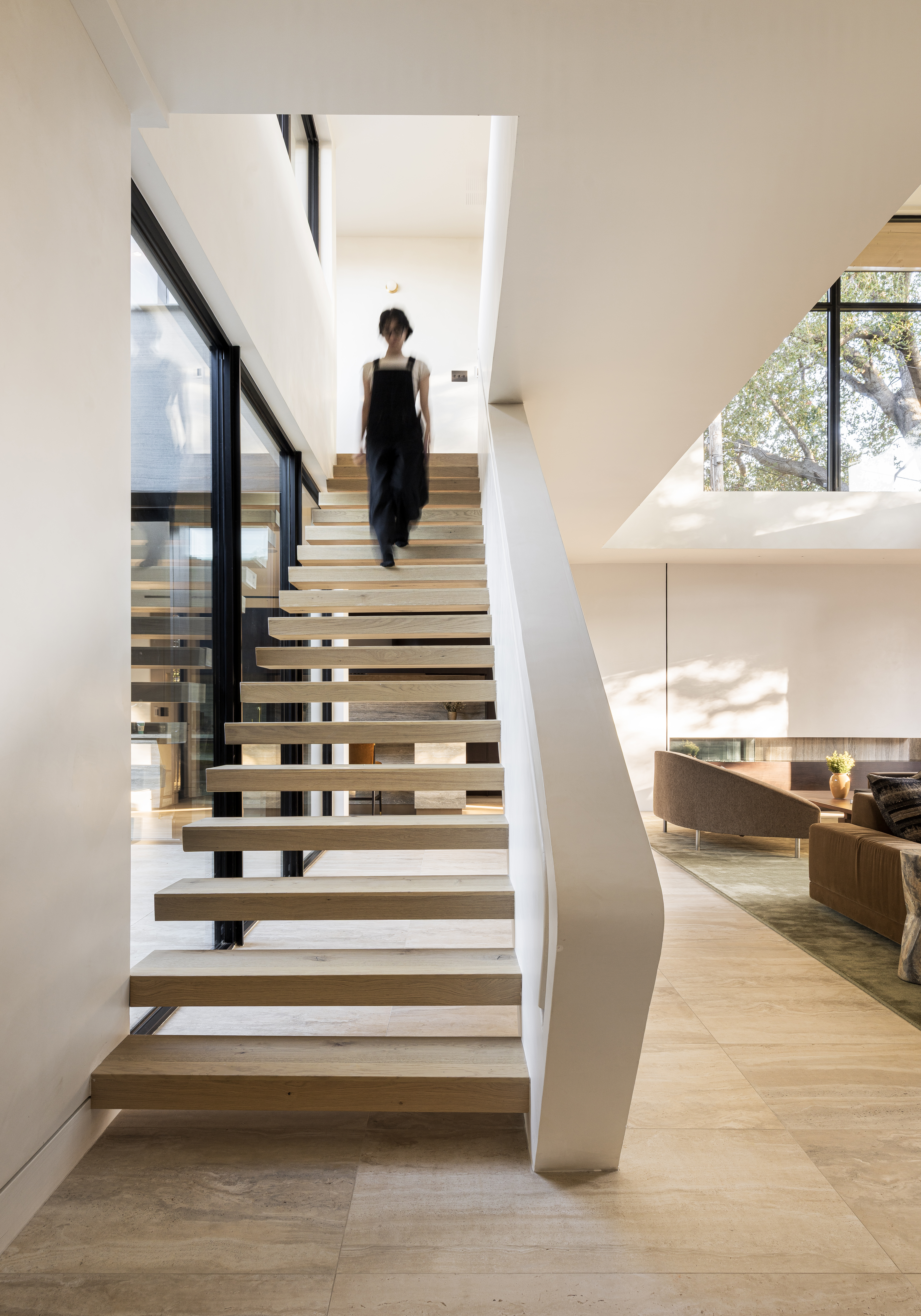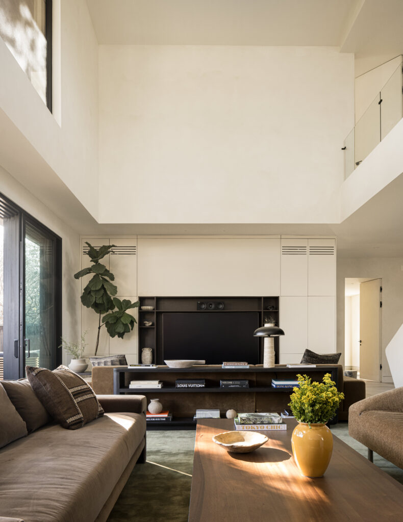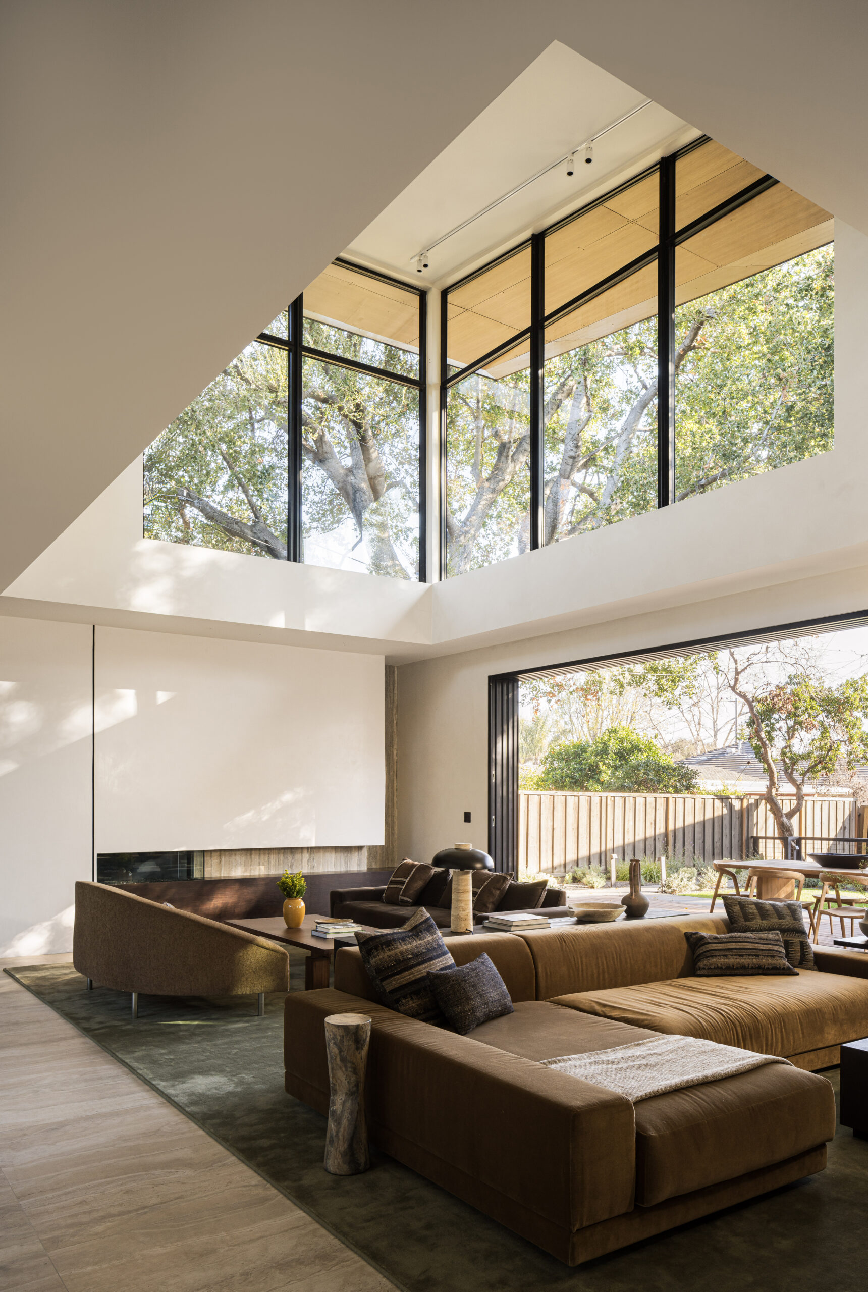 The architectural approach strategically positions the second story to avoid casting shadows on the courtyard, allowing it to remain an inviting space throughout the day. The carefully planned layout uses vertical and horizontal planes to define spaces while maintaining a sense of openness. As one moves through the home, the journey transitions from a single-story, introverted expression along the street-facing frontage to an expansive, double-height family room at the rear. This space acts as a bridge between the central courtyard and the lush backyard, creating a seamless flow that fosters both intimacy and openness.