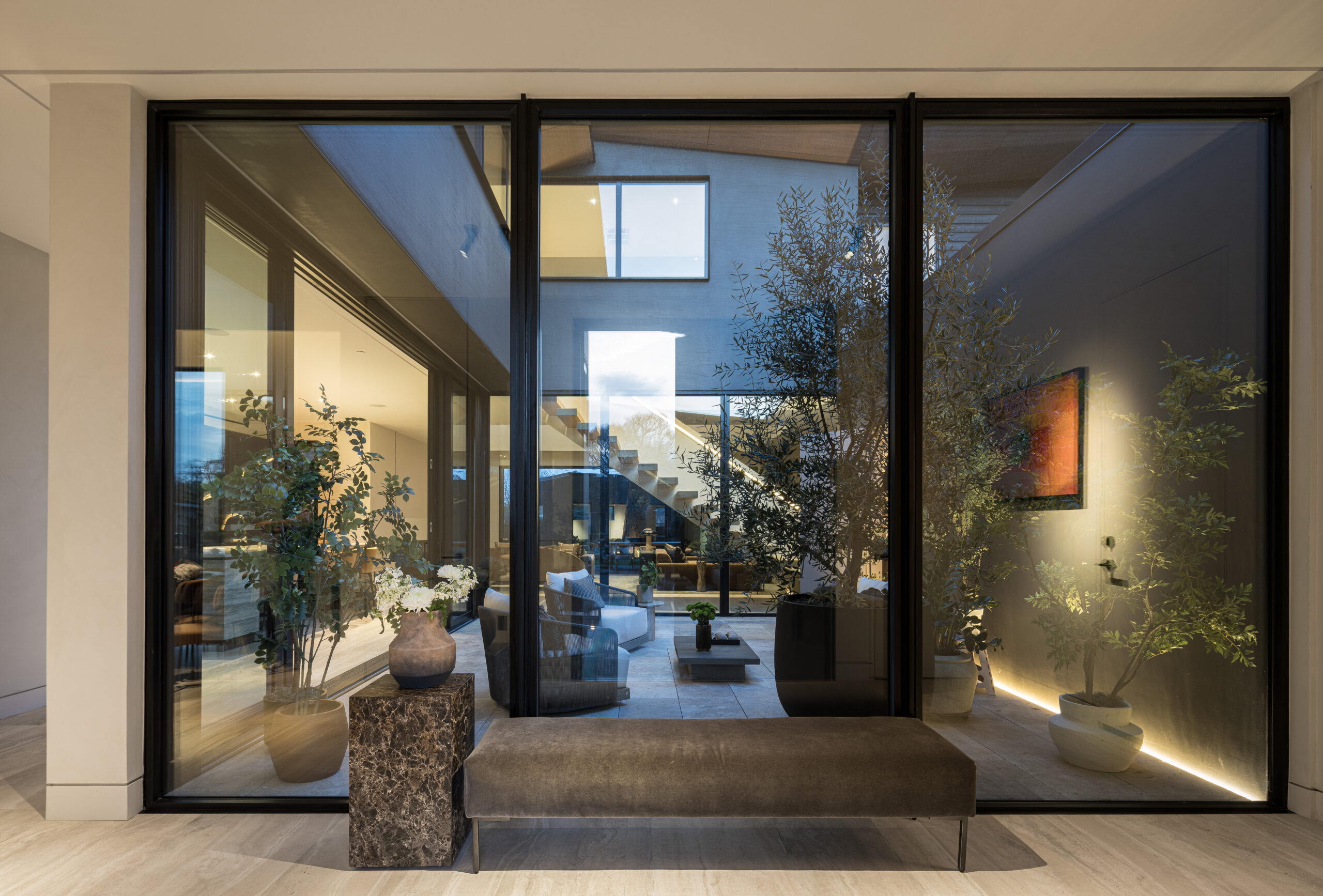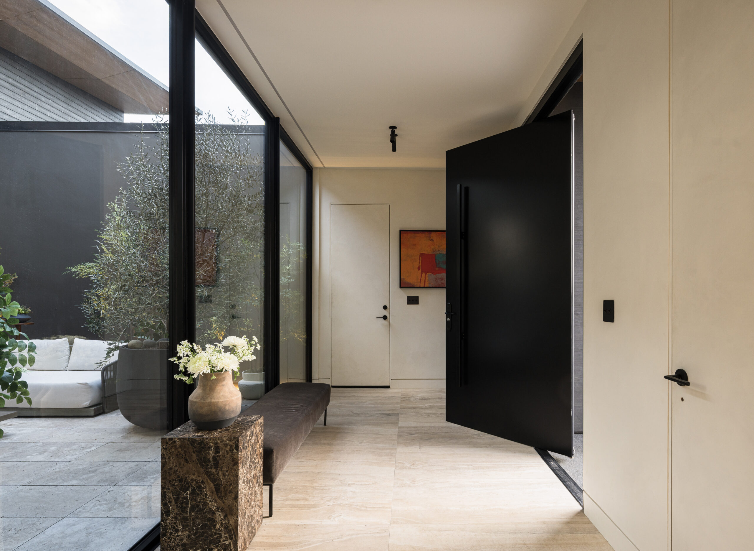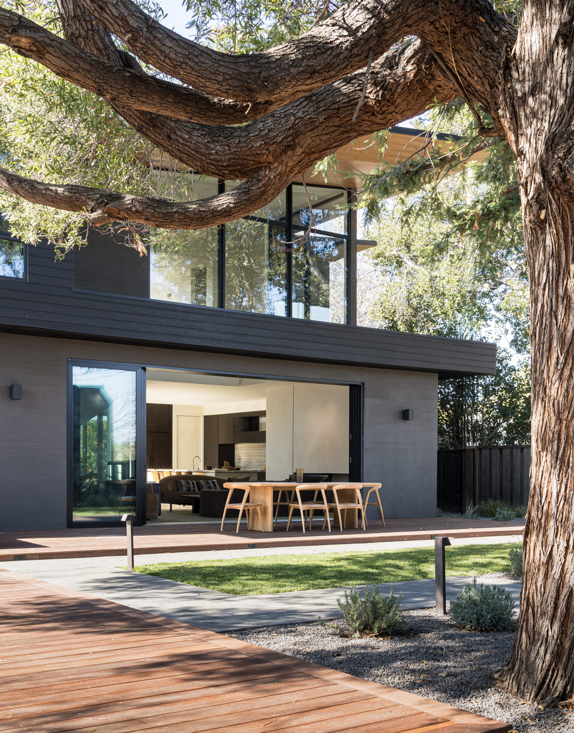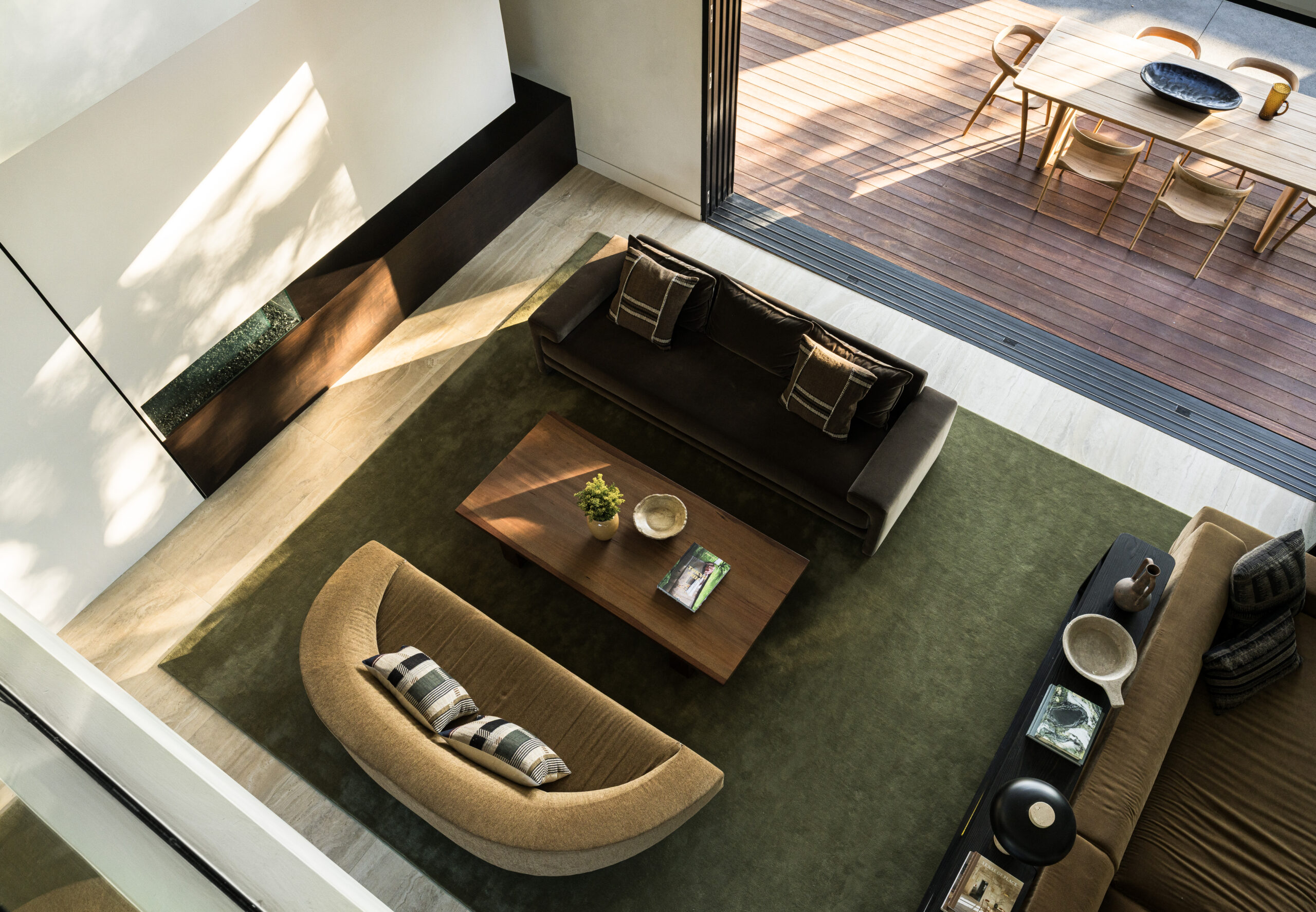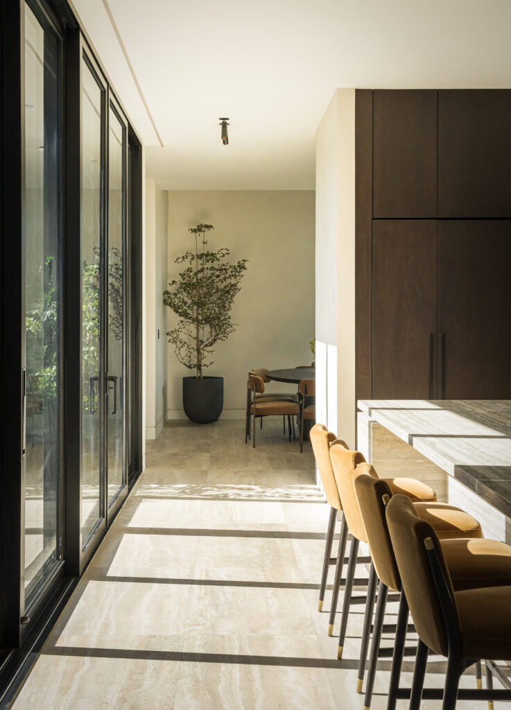 The architectural approach strategically positions the second story to avoid casting shadows on the courtyard, allowing it to remain an inviting space throughout the day. The carefully planned layout uses vertical and horizontal planes to define spaces while maintaining a sense of openness. As one moves through the home, the journey transitions from a single-story, introverted expression along the street-facing frontage to an expansive, double-height family room at the rear. This space acts as a bridge between the central courtyard and the lush backyard, creating a seamless flow that fosters both intimacy and openness.