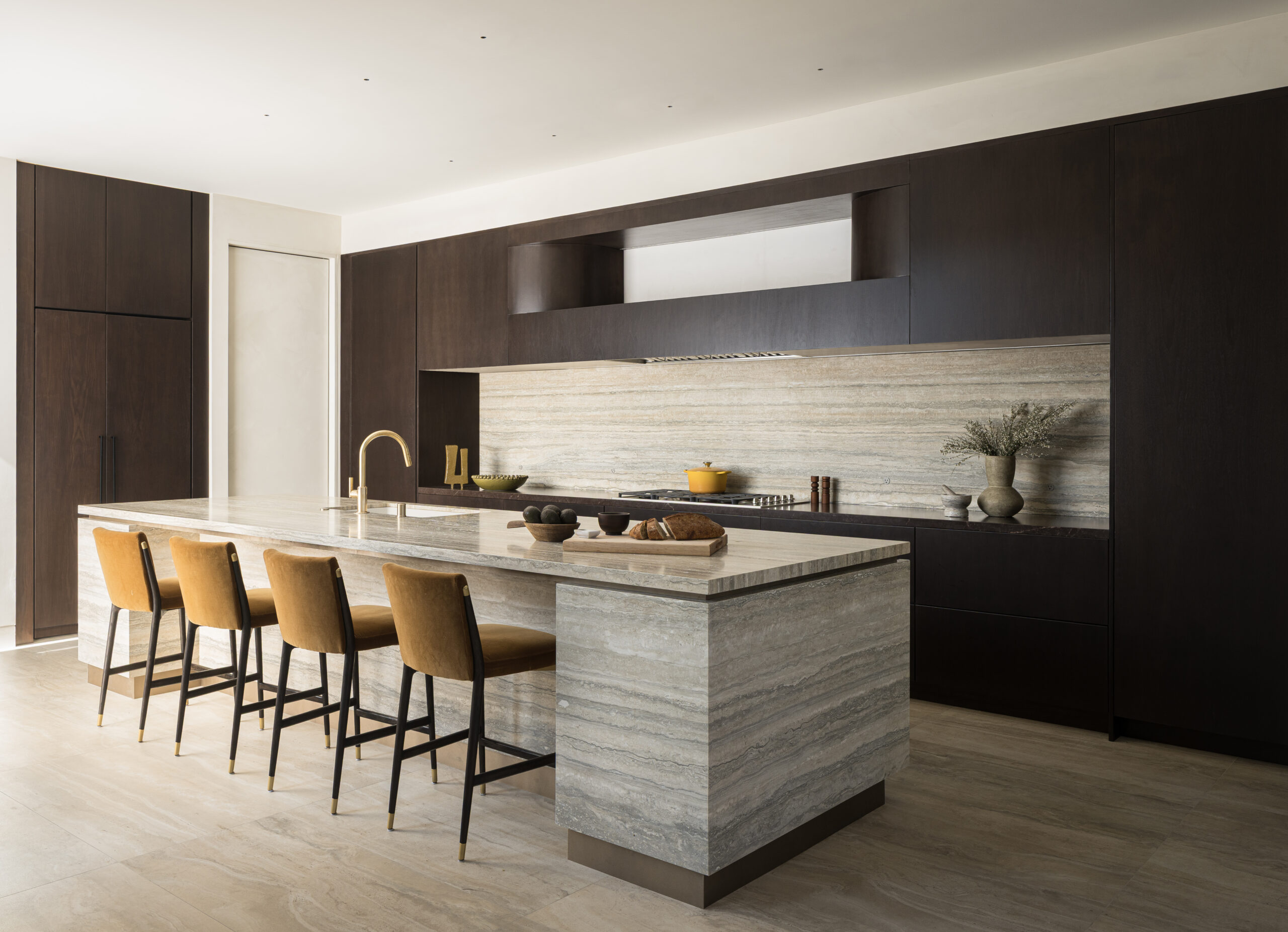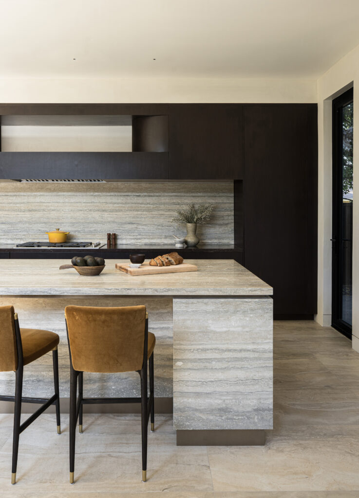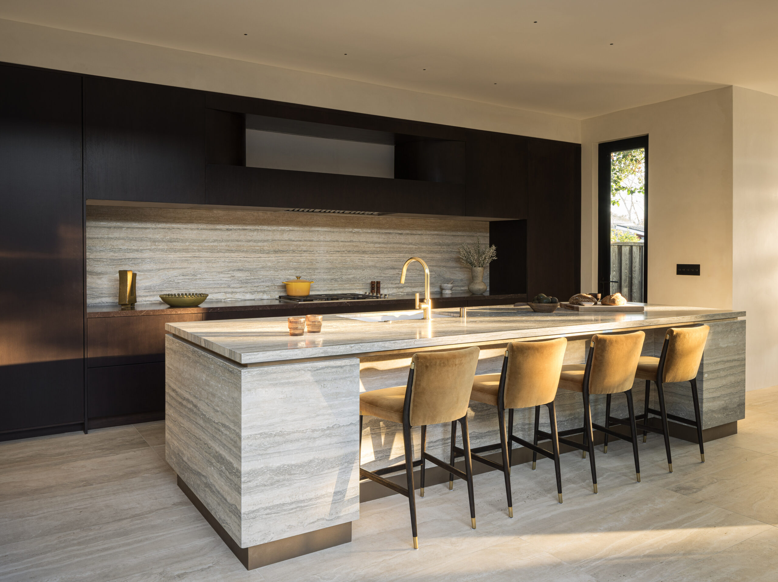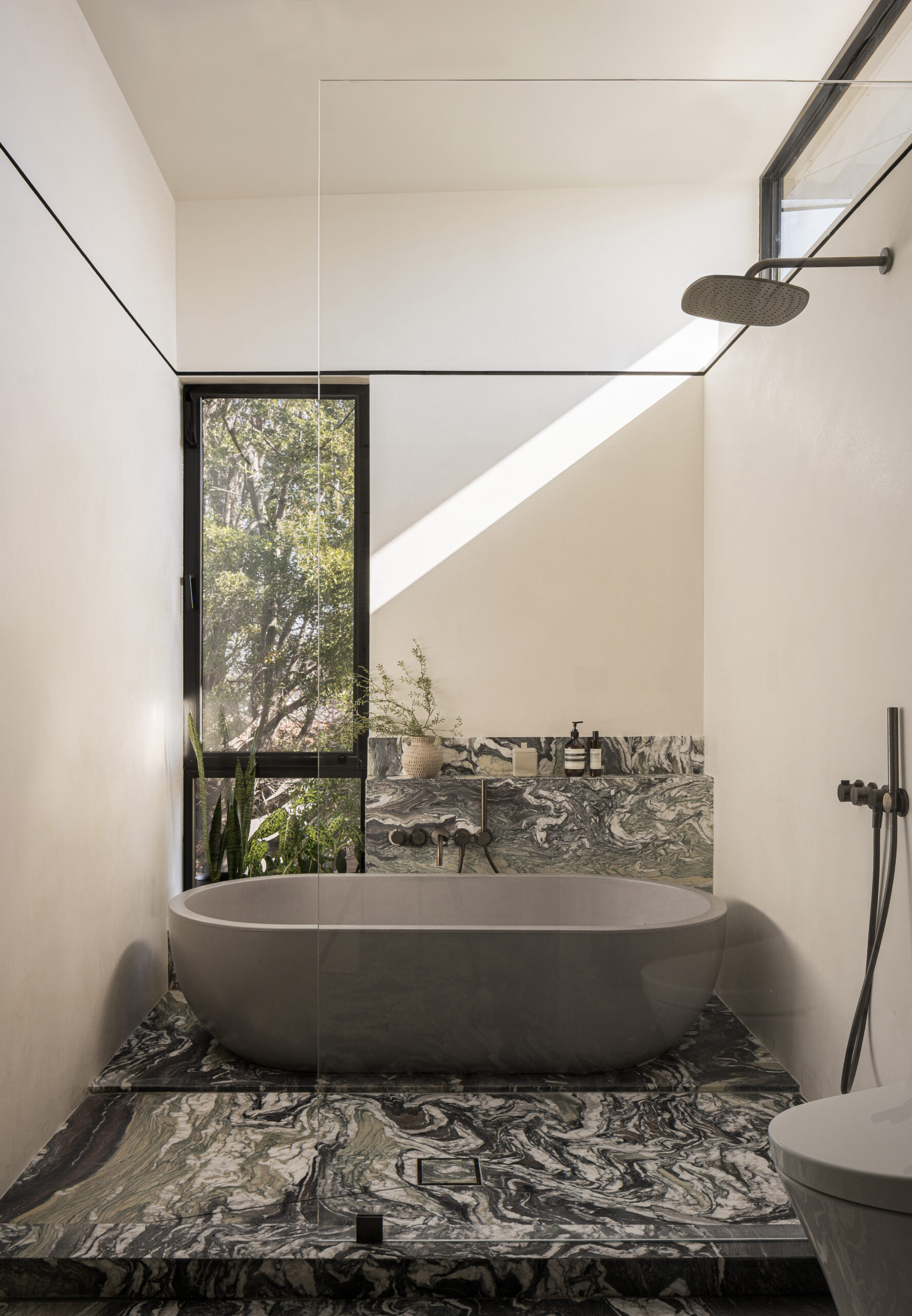 The architectural approach strategically positions the second story to avoid casting shadows on the courtyard, allowing it to remain an inviting space throughout the day. The carefully planned layout uses vertical and horizontal planes to define spaces while maintaining a sense of openness. As one moves through the home, the journey transitions from a single-story, introverted expression along the street-facing frontage to an expansive, double-height family room at the rear. This space acts as a bridge between the central courtyard and the lush backyard, creating a seamless flow that fosters both intimacy and openness.