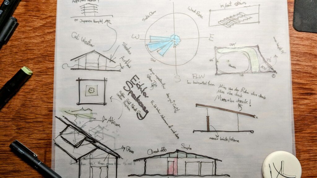 The initial concept sketches for this project explore multiple ideas, reflecting the design team’s early-stage creativity and iterative process. These sketches present a range of layouts and spatial arrangements, balancing functional requirements with aesthetic aspirations. The courtyard emerged as the unifying element across these explorations, anchoring the design in a timeless solution for urban living.